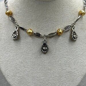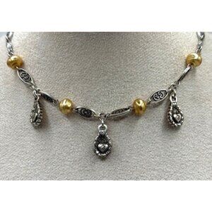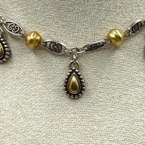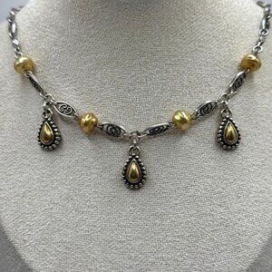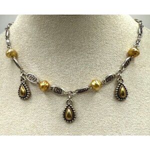 This Brighton necklace features a two-tone design with intricate silver and gold detailing. The teardrop charms add elegance, making it an ideal accessory for professional or formal settings.