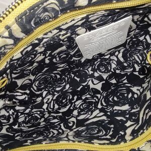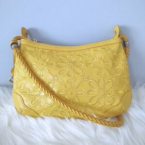 This adorable Brighton Valencia leather shoulder bag has an embroidered floral pattern in a sunny yellow hue. The braided strap is the perfect touch--a great spring/summer bag. In excellent preloved condition. One of the edges has minor rubbing and there is a small spot (just a different shade of yellow) on one one side, but the other edges and the main bag, strap, and interior are super clean!