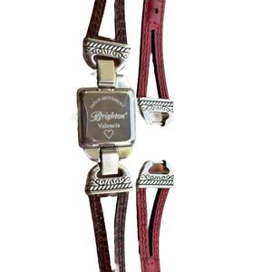 The Brighton Valencia Silverplate Watch features a square silver plated case with a polished finish and a white dial adorned with Arabic numerals. The watch has a fixed silver bezel and a buckle closure on a two-piece leather strap in a choice of red, brown, or black. With a case size of 32mm and a case thickness of 8mm, this classic and casual timepiece includes a seconds hand and a 12-hour dial, making it a stylish accessory for women with a wrist size ranging from 5.5" to 6.5". The watch comes with original packaging and has a reversible band option. Battery needs to be changed and some wear on the bands due to wear from the buckle. As Is