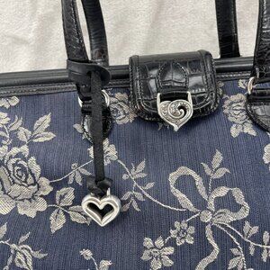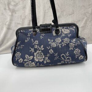 Brighton vintage tapestry/ carpet bag in blue & white rose print with black croc embossed leather handles. Hinged opening with magnetic snap. Measurements included in photos.