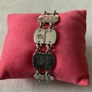 Brighton vintage bracelet features a reversible bracelet. On the front there are discs with different symbols. To name a few a hand, heart, fancy flower, angel, heart that says love, a horseshoe, tree of life and angel wings.
