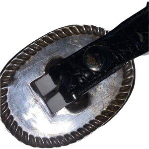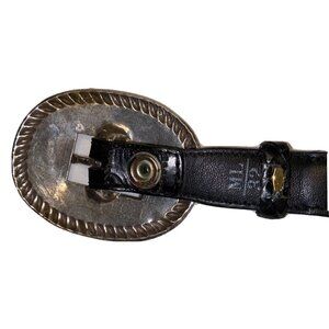Silver buckle and accent pieces spaced along the belt. Overall length is 34 1/2"