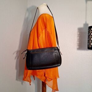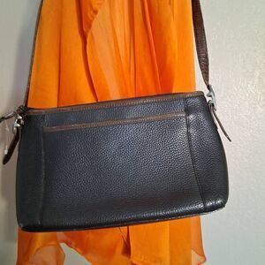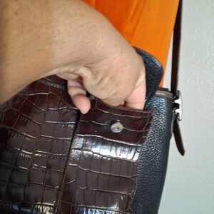 Elegant Brighton shoulder bag. Croc-embossed brown leather. Black textured accents. Inside and outside pockets. Stylish and versatile. Pre-owned in good condition. Please refer to pictures for best description, condition verification, and dimensions.