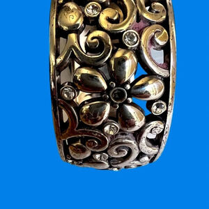bracelet is reversible with white stones and Swarovski Crystal insets on one side and silver and Swarovski Crystal insets on the other. Approximately 3.5” diameter, large heavy beautiful bracelet. See pictures for details.