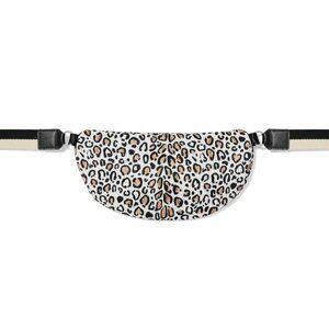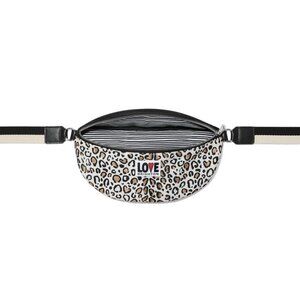 Brighton Wild Cat Belt Bag. The classic belt bag by designer Britney Drumheller has its own love patch adhered to is leopard print that she hand drew. A black zipper and a two- tone black & tonal webbing matches the ground of the leopard print. It's a basic leopard print however the print has some hearts camouflaged in that look like leopard spots.
