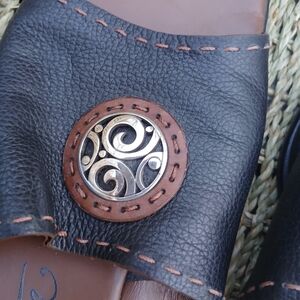 Step into comfort and style with 's women's slide sandals. Featuring a chic black leather upper with brown accents, these sandals are perfect for any casual outing.