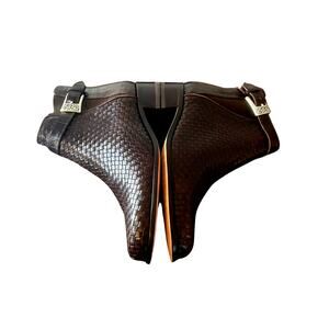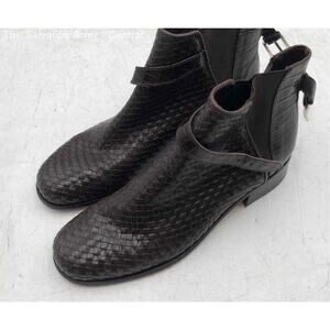 They have a cool textured woven leather low stacked heel, silver-tone hardware buckle details, and classic pull-on style.