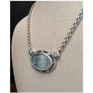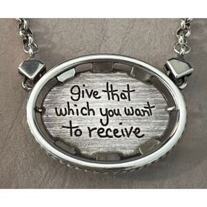A great pendant necklace from Brighton in an iridescent gray shell for the main stone. It has lavenders stones that are around the main stone. It is silver stone and adjustable. On the back of the pendent is engraved “Give that which you want to receive”. Making it the perfect gift for Christmas. It is very pretty and in great shape.