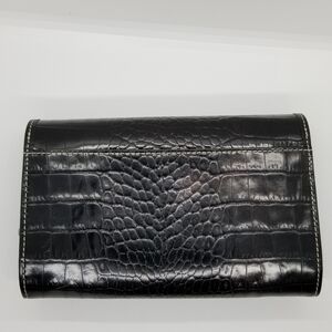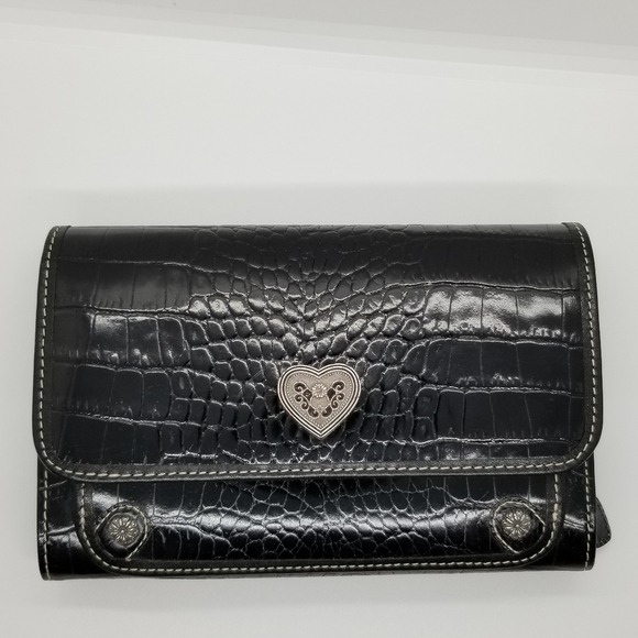 Large black wallet with a croc-embossed finish. Front has a silver heart and silver flowers in the corners. Exterior has one slip pocket in the back. Magnetic flap closure opens up to loads of slots for cards, multiple clear slots for IDs, two zip pockets, and some loops if you want to attach a strap. Strap is not included. Interior is very clean. Measures approximately 7.25" x 4.75" x 1"