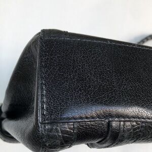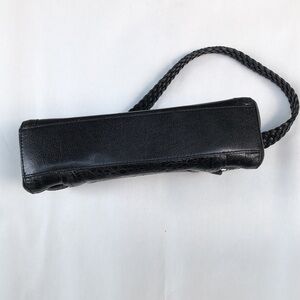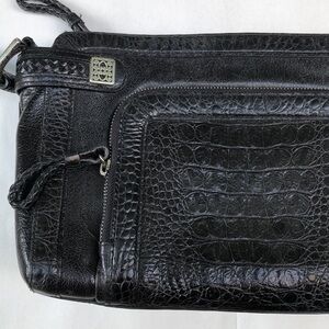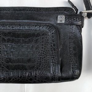Black leather with gator like front zip wallet compartment. Several pockets and side compartment on inside. Silver details.