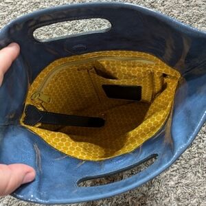 Brighton blue small patent leather shoulder bag . A few small stains on the front leather (see photos)