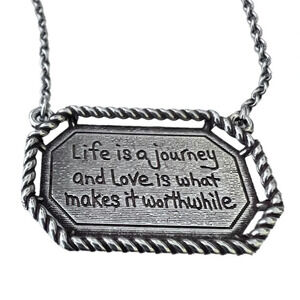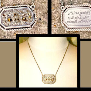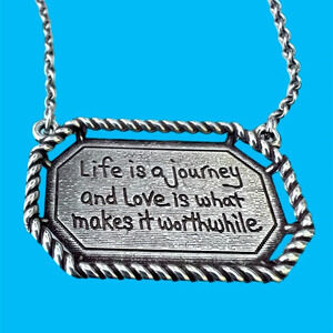 Necklace is a woven link design measuring 18"-20" adjustable with a double lobster claw clasp closure and features a rectangular swarovski crystal encrusted pendant with rope-frame detailing and the inscribed message "Life Is A Journey and Love Is What Makes It Worthwhile". The pendant has a 1" drop and is 1 3/8" wide.