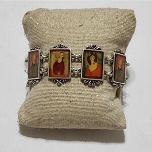 A tapestry of history and art, this unique bracelet showcases miniature portrait art in ornate, vintage-inspired frames. Six distinct portraits capture a sense of timeless elegance and refined taste, gracefully linked together with intricate silver-tone connectors and a secure toggle clasp adorned with heart charms. The exquisite detail and evocative imagery invite you to embrace a wearable art piece that sparks conversation and adds a touch of sophistication to your personal style. It's a captivating adornment that enhances your presence at an art gallery opening, adds a dash of intrigue to your favorite little black dress at a cocktail party, or serves as an enchanting statement piece during an evening at the theater.