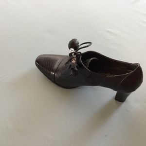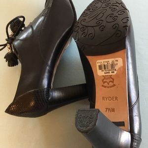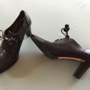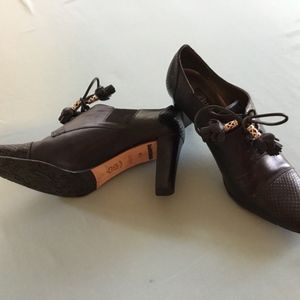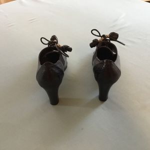 Brighton black lace up leather shoes with tassels front and black snake leather with 3” heel.