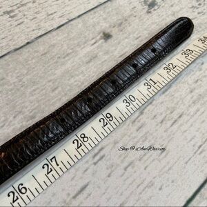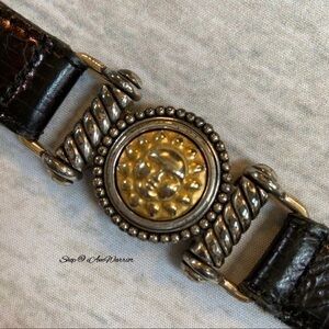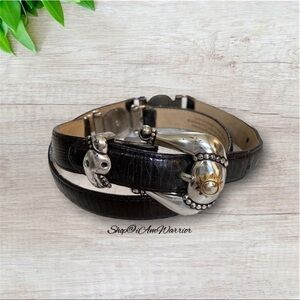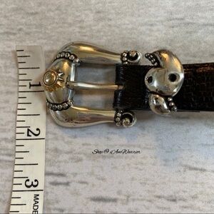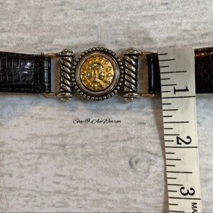 Rare Brighton museum collection black leather skinny belt with two tone gold/silver sun designs. GUC, some scratches on metal. Adjusts from approx 28-32โ as shown. Please see all photos for details.