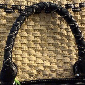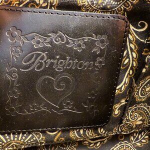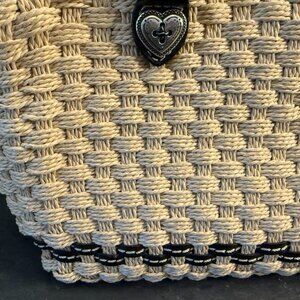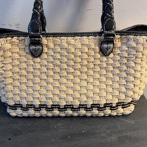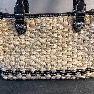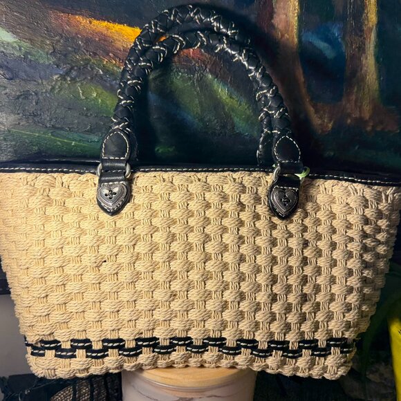 Brighton natural woven bag with black twisted handles. Silver hardware with 2 Brighton hearts on each side anchoring the handles. Lovely black, cream, gold and paisley lined interior with Brighton signature logo on interior pocket and a black snap closure. A beautiful summer accessory that will soon be your favorite! This bag has been used only a few times, so has a few scuffs and minute shape shift, but is in in really good condition and ready for some fun! 11" x 5" on bottom. 7" from top of bag to bottom. 12" from top of strap to bottom.