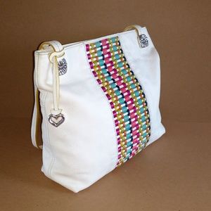 This bag is awesome and will coordinate with a lot of wardrobe options. This Brighton rainbow weave white leather shoulder bag has silver-tone decorative jewelry-like hardware, a multicolored leather weave design, dual straps, back exterior magnetic compartment, main magnetic closure, 2 interior sidewall zipper pockets, 2 interior slip pockets and a key holder. Overall, in good condition w/a clean interior/exterior, but w/tarnished hardware, minor discolored/worn leather & edging, see pics. 👄