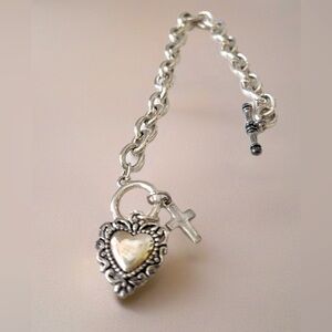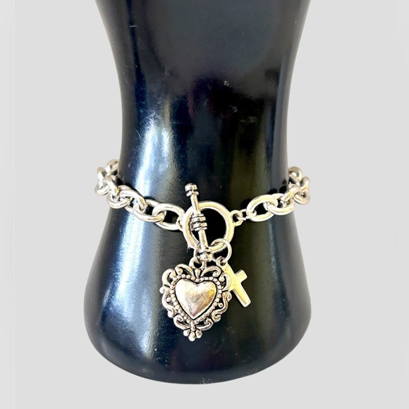 Brighton retired silver toned heart bracelet. Cross charm on Bracelet. Excellent