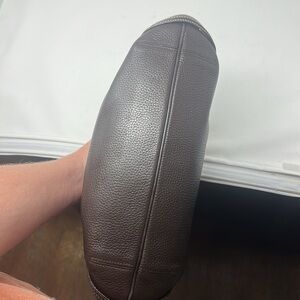 Preowned. Brighton dark brown pebbled, leather magnetic closure, shoulder bag. Key keeper inside. Dust bag included. Main compartment is magnetic main closure, snap full-size compartment and zipper full-size compartment. Notice slight wear on bottom as pictured both sides. Slight tarnish on Brighton charm. Bag measures approximately 15 inches across 8 inches deep and 2 inches across the bottom. Strap drop is 13 inches.