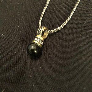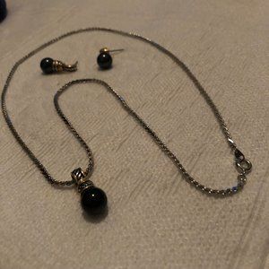 Necklace is silver chain about 11" total chain length w/clasp; detachable silver/gold with black onyx ball pendant (pendant about 1" long - just the slightest bit smaller than earrings)