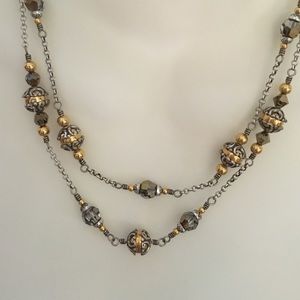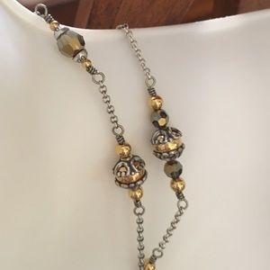 NWOT Brighton gold and silver with brown and grey crystals. Design is two chain look. Balls are gold and silver balls with heart design. Also has gold little balls with big and little crystals.. Has brown crystal charm near clasp. Clasp is a lobster claw with heart design. Great with this season fall designsππ