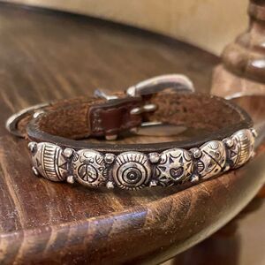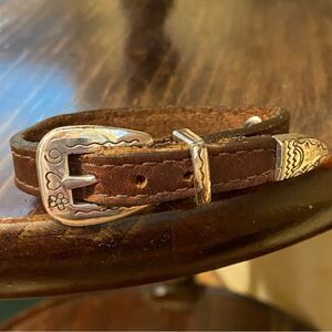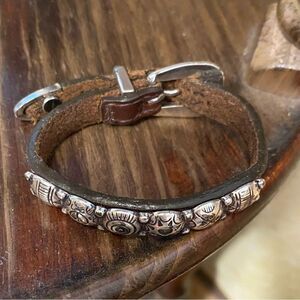 Retired Brighton vintage Harmony silver mini medallion & brown leather bracelet with belt buckle style closure. Good condition, brown leather, antiqued silver, approximately 7” long, see pictures for details.