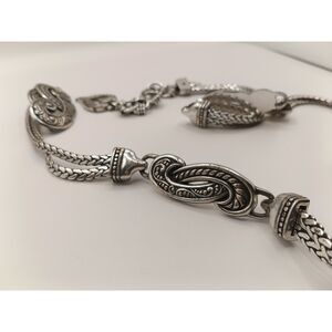 Elegant vintage Brighton silver-tone metal chain-link belt featuring intricate details. Elevate your style with this classic accessory. Perfect for adding a touch of timeless sophistication to any outfit. A must-have for Brighton collectors and vintage fashion enthusiasts.