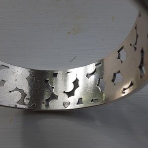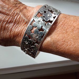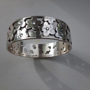 Silver tone bangle with flower design. Flowers have small clear stone centers. 3/4 inch wide band.