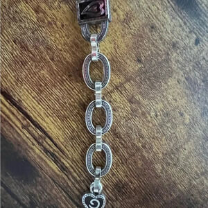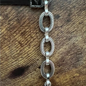 Brighton woman’s leather belt. Size: 28”. # S B 30513. Beautiful black leather with silver plated etched buckle with tiny hearts on it. It’s a hook type buckle with a four link silver dangle with a heart tab on the end. Very nice belt. Size: 28”, width: 1/2”. Good condition.