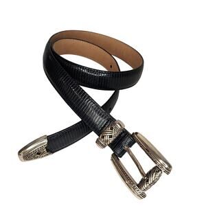 Brighton womens black Leather Belt sz Small Lizard Patern Ornate Silver Hardware