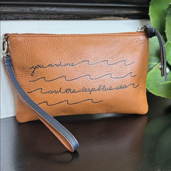 This authentic Brighton wristlet is crafted from supple genuine leather in a warm cognac tone, accented with navy trim for a stylish coastal look. One side features a detailed crab design, while the other showcases whimsical script reading “you and me and the deep blue sea.”