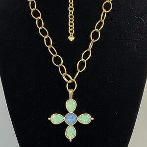 Elegant gold toned chain necklace featuring a striking blue and green pendant. Perfect for adding a touch of sophistication to any outfit. Says Love Shines on the back. Great condition! About 30 inches long with 2 inch extender.