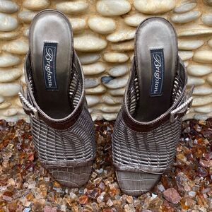 Brighton Pewter/Silver Woven Reed Slide Open Toe Heel Sandal Leather Size 7M EUC