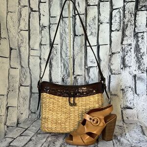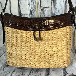 Brighton brand cream, weave straw handbag with mock crock, leather trim used condition does have wear and tear on the straw in great condition but I do think if you’re OK with a little bit of a warn look, it still has lots of love. Left the handles and leather are in great conditions. This handbag measures 10 inches across by 8 inches tall.