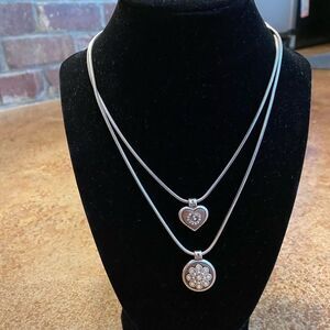 Like new vintage retired rare find BRIGHTON Double Strand heart and round pink and Swarovski crystal pendants NECKLACE. EUC, great shape, silver on one side, pink and crystals on the other, approximately 18-20” with extender and lobster claw clasp. See pictures for details.