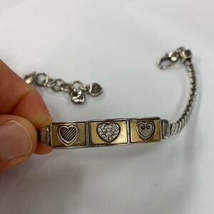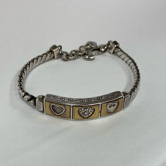 Preloved Vintage Brighton triple heart gold and silver link bracelet. Good condition, a few wear marks, inset Swarovski Crystals, 7 1/2” long with extender. See pictures for details.