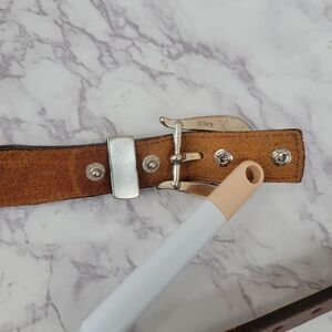 Brown leather belt with silver toned buckle and tail slide. Silver toned mickey mouse accents / conchos.