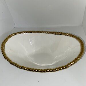 Listing a beautiful porcelain serving bowl from Brilliant company.Gold trim beaded rim. and white porcelain body. Dishwasher and food safe. Made to appear hand made with a rustic shape.. Like New.. Never used, just pre owned..