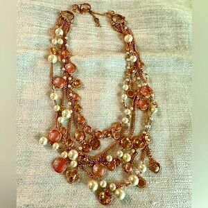 Stunning!!!!!! EUC Henri Bendel rose gold tone multi strand necklace with Swarovski crystals. Tons of dangles, faux pearls, and charms, 20" to 22", I do not see any callouts and photos were taken from all angles and parts. This is signed in multiple places on the necklace, heavy good quality, see photos. Every part is unique and the charms alone are just absolutely stunning! Photos cannot really capture how gorgeous this piece is. Almost kept it but a bit too long for me. What a conversation piece from such an iconic brand that is sadly no longer in production. A definite collector’s statement necklace.