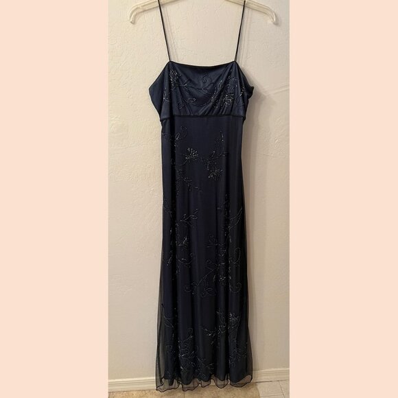 The timelessly elegant beaded evening gown is a Brilliante by JA. In a dark blue (almost black) with spaghetti straps and a straight neckline, it has a beaded overskirt that is both understated and elegant at the same time. With a high waistline it flows softly to the floor creating a beautiful silhouette. The material is 100% polyester and is a size large, 59" from shoulder to hem. The tag says to spot clean only.