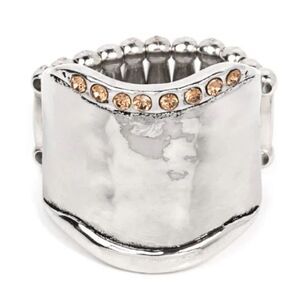 A wave of sparkling dainty light topaz rhinestones floats across the border of a wide hammered silver band. The opposite border is free of adornment, resulting in an upscale artisan edge. Features a stretchy band for a flexible fit.