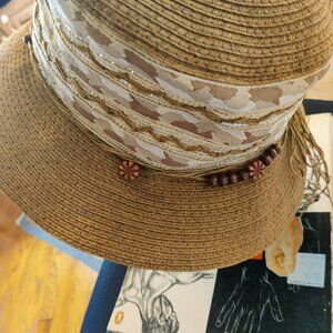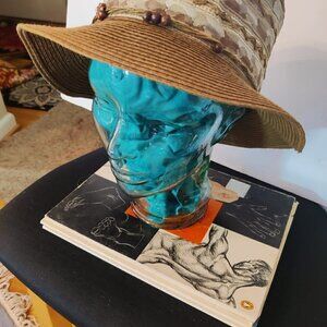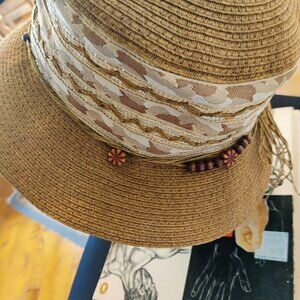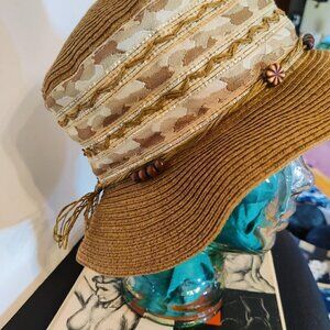 Dark Tan Brim and Crown finely stitched. The base is a pretty fabric with gold threading going around. Lightweight and breathable for summer aftrnoons. Beadwork strung on rafia and tied in a bow at back.Vintage
