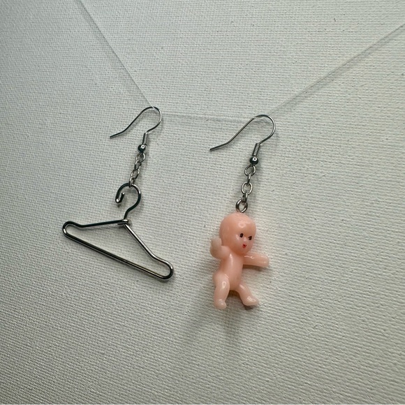 Unique earrings featuring a pink baby charm and a silver hanger charm. Perfect for adding a playful touch to any outfit.