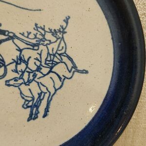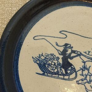 Vintage Brinker Pots Santa Sleigh and Reindeer Plate. Beautiful blue and gray handmade round pottery plate that would make a wonderful holiday decor piece or a cookie plate for Santa!