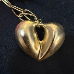 * A 24k antique gold plated large puffy heart hangs from a 24k antique gold plated paperclip chain with a toggle closure