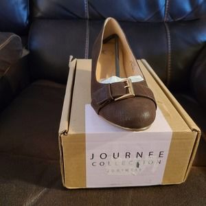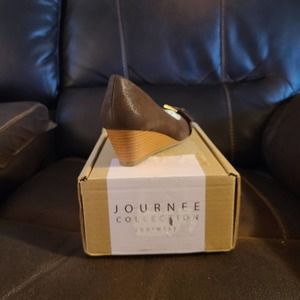 Brinley Co.Gael Faux Suede Buckle Detail Comfort-Sole Wedges Brown, 8.5 US