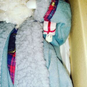 Selling my 1990 11.5" Brinn's Santa with Authentication Card; he is holding a shiny bell and decorated reef in his right hand. The left hand he is holding a present, a music sheet rolled up. All Tags included. With Original Red Box with window.