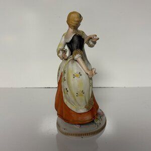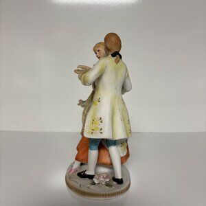 This finely detailed porcelain figurine features a Victorian-era couple in a dance pose. It is painted with intricate colors and details, making it an elegant addition to your decor or collection.