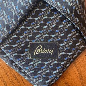 Elegant Brioni tie with a blue and black pattern. 100% silk. Great used condition!