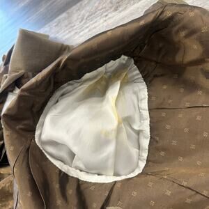 In good pre-owned condition, stained armpit, vintage, heavyweight, nylon interior, 1/2 wool suede silk, 100% rayon, single breasted, three button sleeve, notch, front pockets, made in Italy.